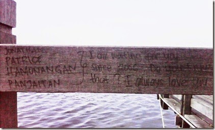 Flashback dikit ke pantai Ancol yang airnya coklat2 gimana gitu (definitely polluted). Gue nggak berani nyebur ke situ soalnya entar takutnya jadi monster mutan kayak di serial Jiban. Makanya gue kepengen banget maen ke Pulau Seribu. Denger2 di sana pastainya masih alami. Nah, selama di sini gue sempet memfoto vandalisme ala anak2 ABG sekarang yang ternyata kocak banget dan bikin gue geleng2 kepala. Kapan tobatnya nih anak2 Jakarta. Banyak yang curhat, kayak ini nih: